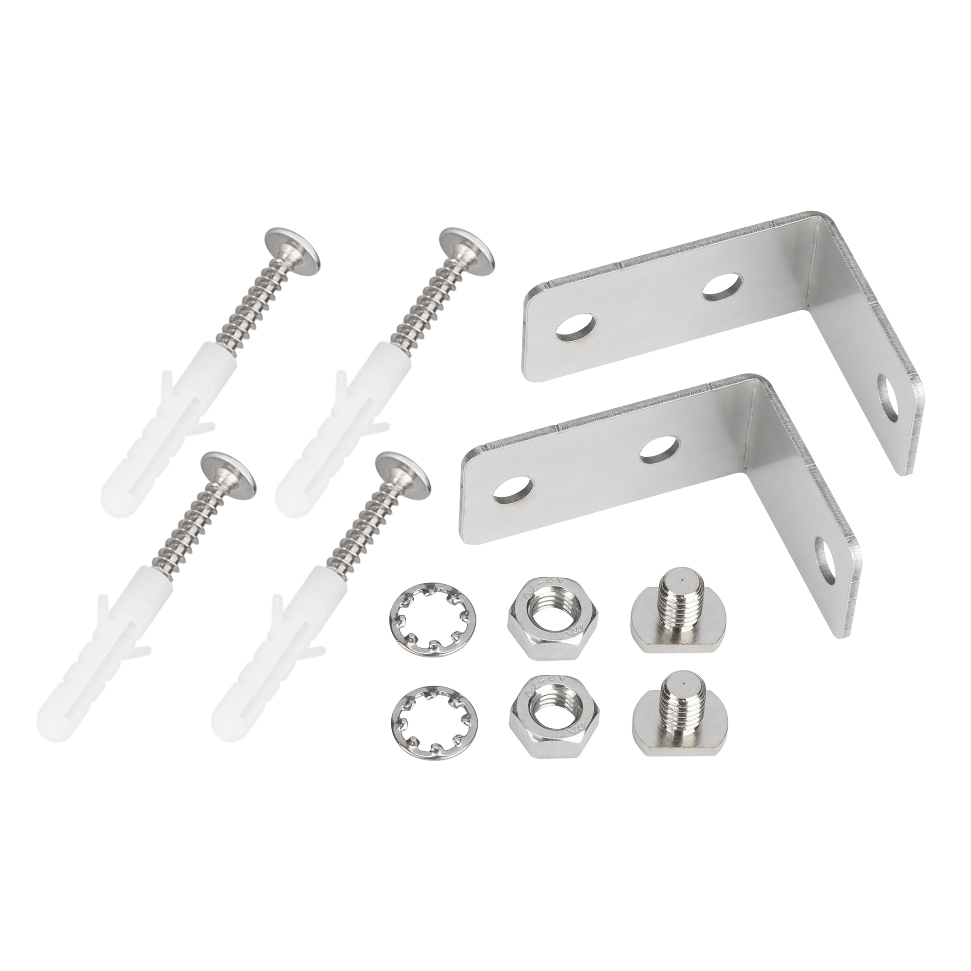 Комплект держателей профиля IP-LINE-4050 для накладного монтажа на стену. В комплекте: держатель - 2 шт., шуруп с дюбелем - 4 шт., гровер - 2 шт., гайка - 2 шт., винт с площадкой - 2 шт. Материал - сталь. Цена за комплект.