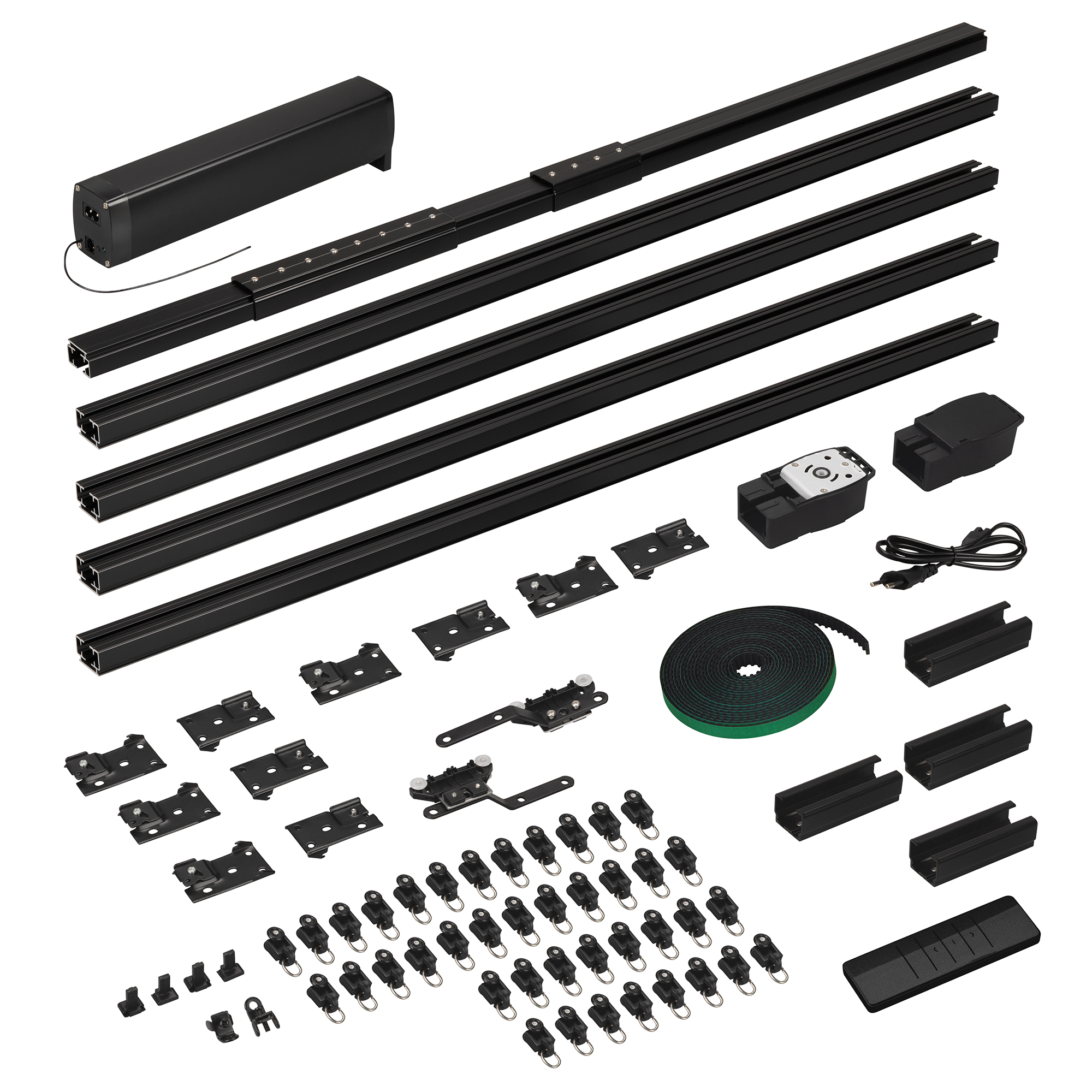 1 мотор, 1 пульт дистанционного управления, алюминиевый профиль 1,6 мм (1м - 4шт, 0.5м - 1шт, 0.2м - 2шт., 0.1м - 1 шт.), 4 соединителя 10 см, 1 соединитель 20 см, 1 переходник 5 см, 2 шкива, 2 пряжки ремня, 2 направляющих бегунка, ремень 10,4 м, 40 бегунка, 2 фиксатора, 10 кронштейнов, 1 зажим на ремень