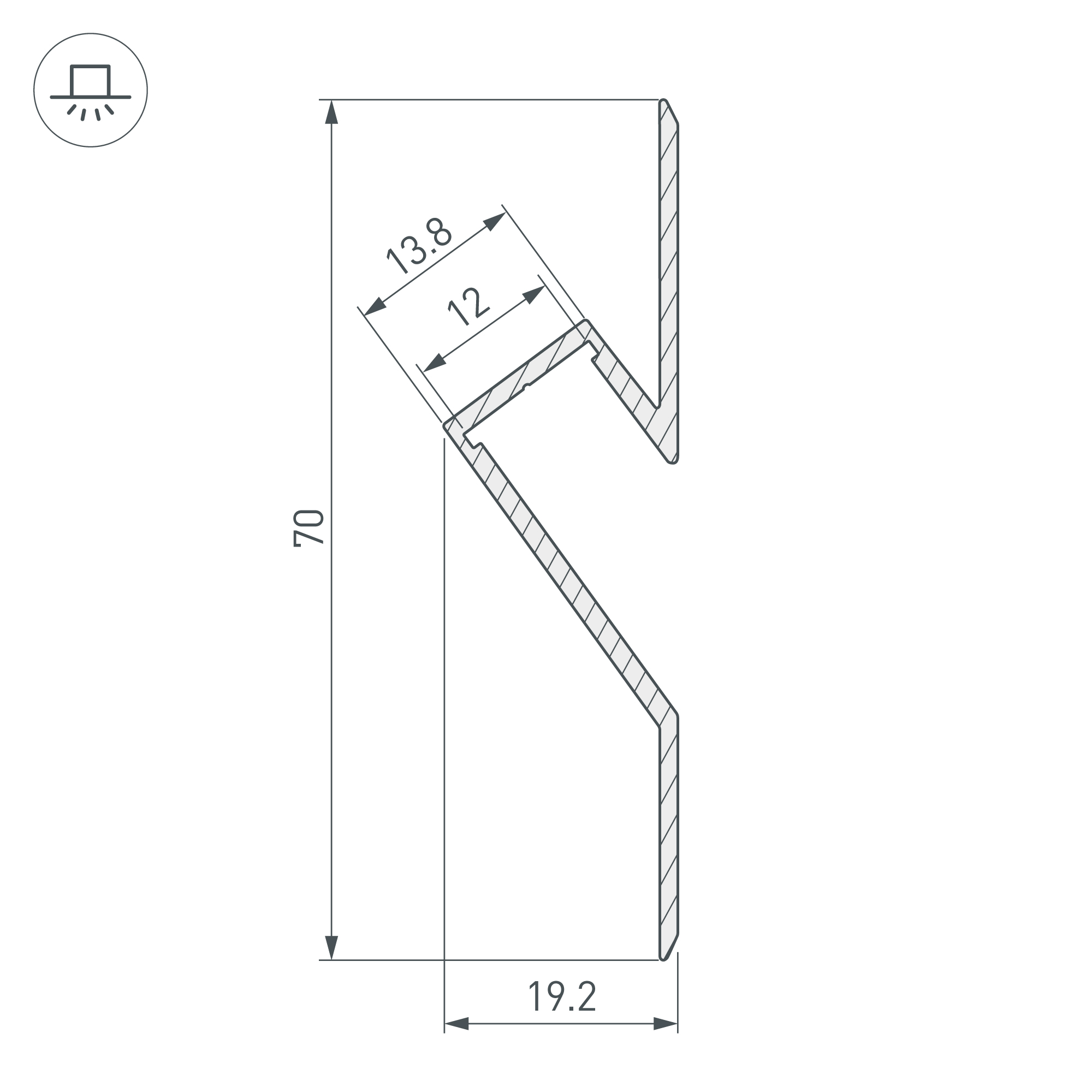 Алюминиевый анодированный встраиваемый профиль для светодиодных лент и линеек. Для создания эффекта «Отраженного света». Габаритные размеры (L×W×H): 2000x19,2x70 мм. Ширина площадки для ленты 12 мм. Заглушки и другие аксессуары приобретаются отдельно. Цена за 1 метр.