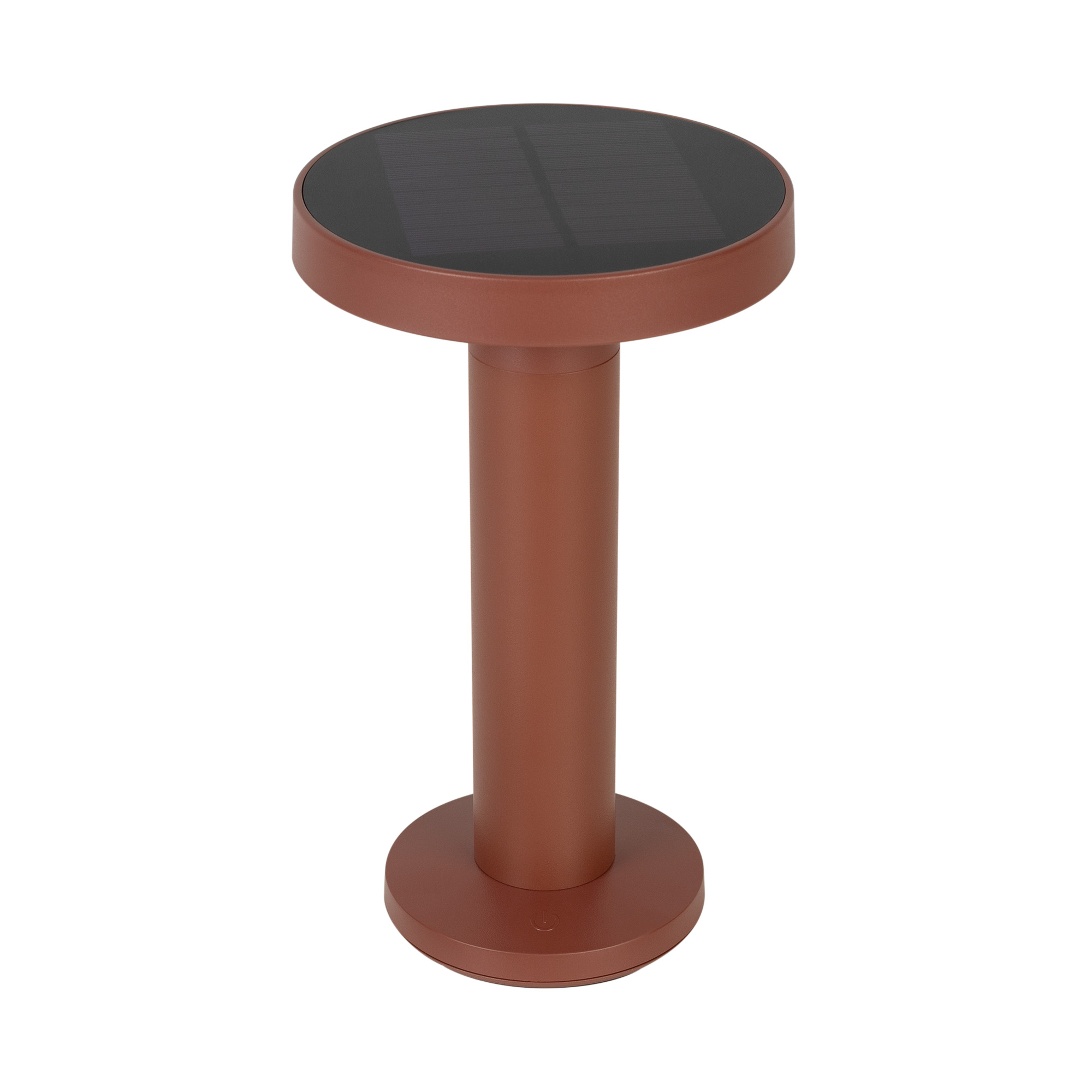 Настольный светильник со встроенным аккумулятором мощностью 1.4Вт, алюминиевый корпус, цвет кортен. Цвет теплый белый 2700K, св.поток 102 лм, CRI(Ra)>85, угол 105°. Размер Ø130x217, размер основания Ø92x18. IP54. Зарядка через кабель USB. Тип встроенного аккумулятора 2000мАч. Солнечная батарея 1.25Вт.